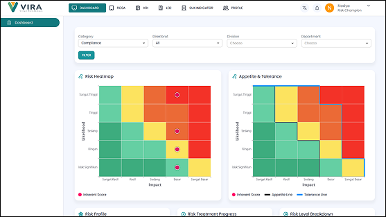 Aplikasi manajemen risiko digital yang membantu bisnis Anda lebih siap menghadapi ketidakpastian. Dari identifikasi hingga pengendalian risiko, semua bisa dilakukan dalam satu platform yang mudah digunakan. Tak perlu spreadsheet yang rumit, VIRA menyederhanakan proses manajemen risiko dan menyajikan data yang Anda butuhkan secara real-time, sehingga keputusan penting bisa diambil dengan lebih percaya diri dan terarah.